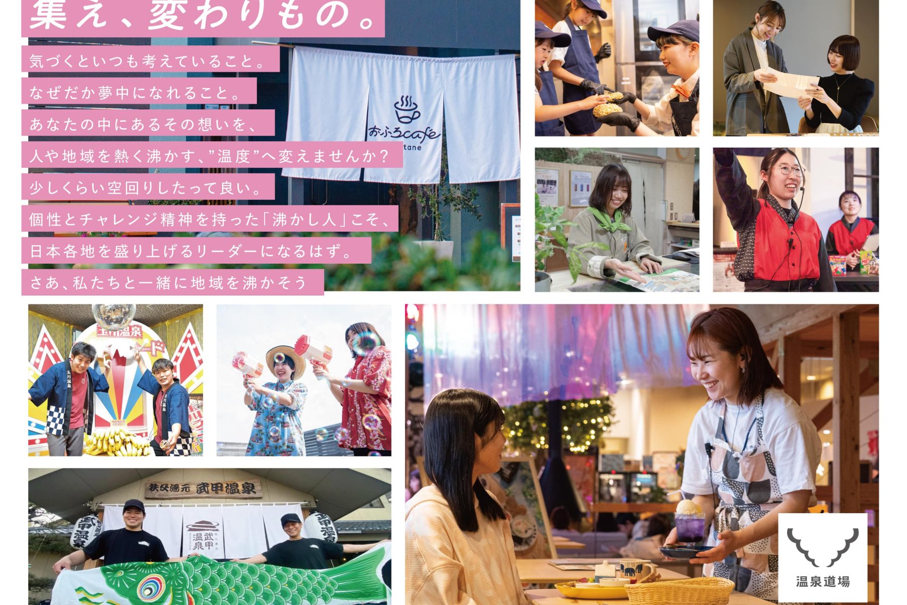 そのために欠かせないのが、地域で活躍するリーダーの育成・輩出です。温泉道場の店舗責任者である「支配人」は、経営においてやらなければならない一連の流れを、決断経験・意思決定・成功/失敗体験を通して学んでいきます。20代のうちから舞台に立ち、「地域を沸かす」ための力をつけたい。打席に立つ経験を重ねて、成長を続けていきたい。そんな仲間に出会いたいと思っています。