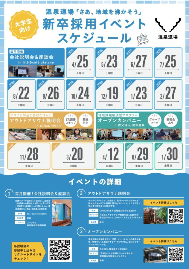 温泉道場では、“全員採用”「一緒に働きたい人は自分たちで採用しよう!」というスタンスを大事にしています。そのため、新卒1年目から、年次、部署を問わず採用プロジェクトに参加することができます。実際に新卒で入社して店舗業務の経験を積んだメンバーも採用に関わっていることも特徴です。さらに、中途入社から温泉道場の中でキャリアを創っている経験豊富なメンバーや、デザインを武器に活躍するメンバーも参加します。就職活動の疑問点から、転職する際の悩みなど、どんな質問でもお聞かせください!(※各イベント毎に参加メンバーは変更します)