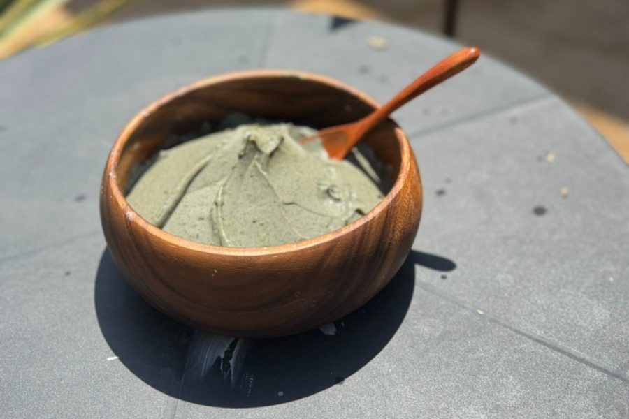 緑茶入り泥パックを顔に「塗る」