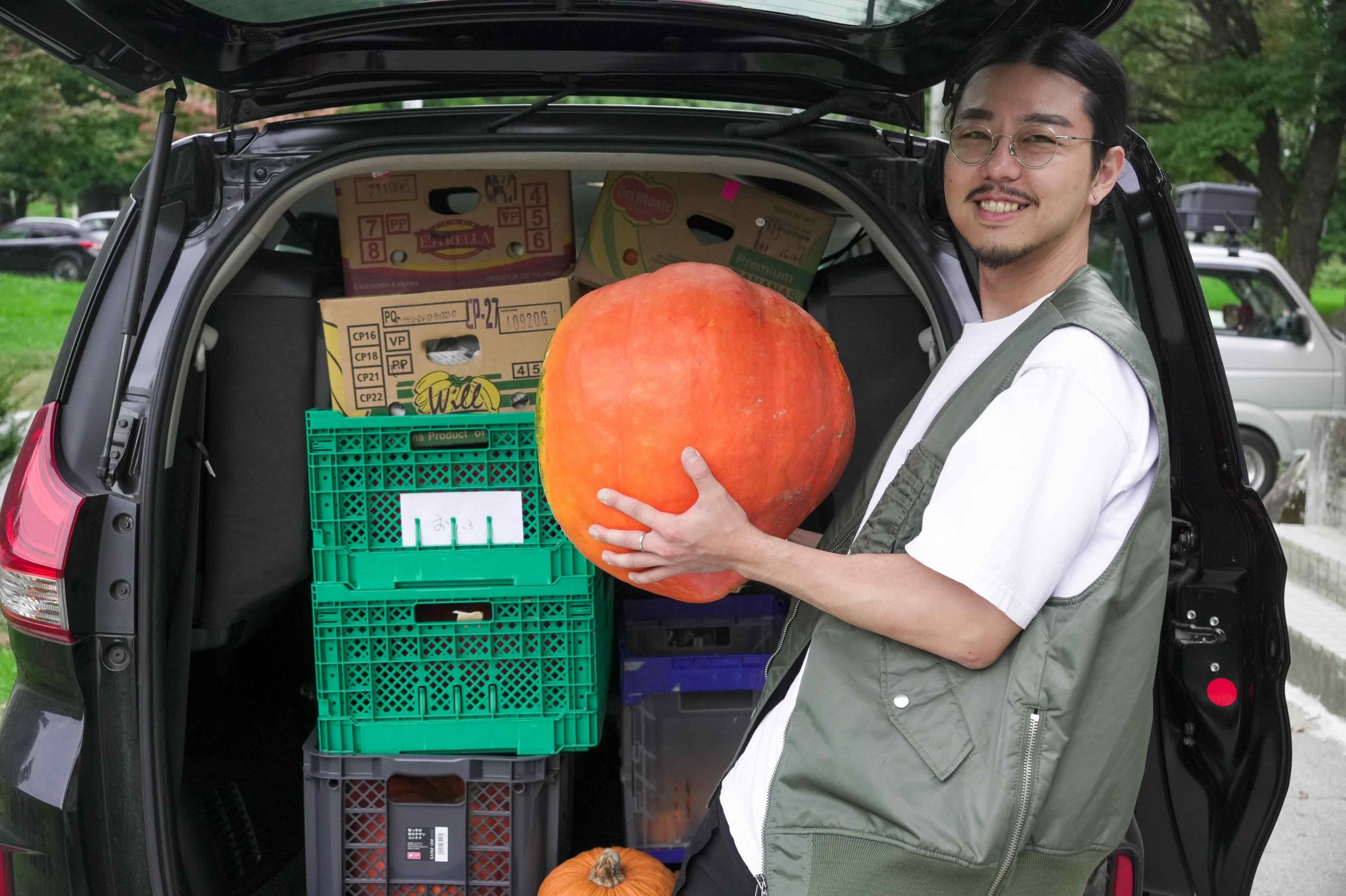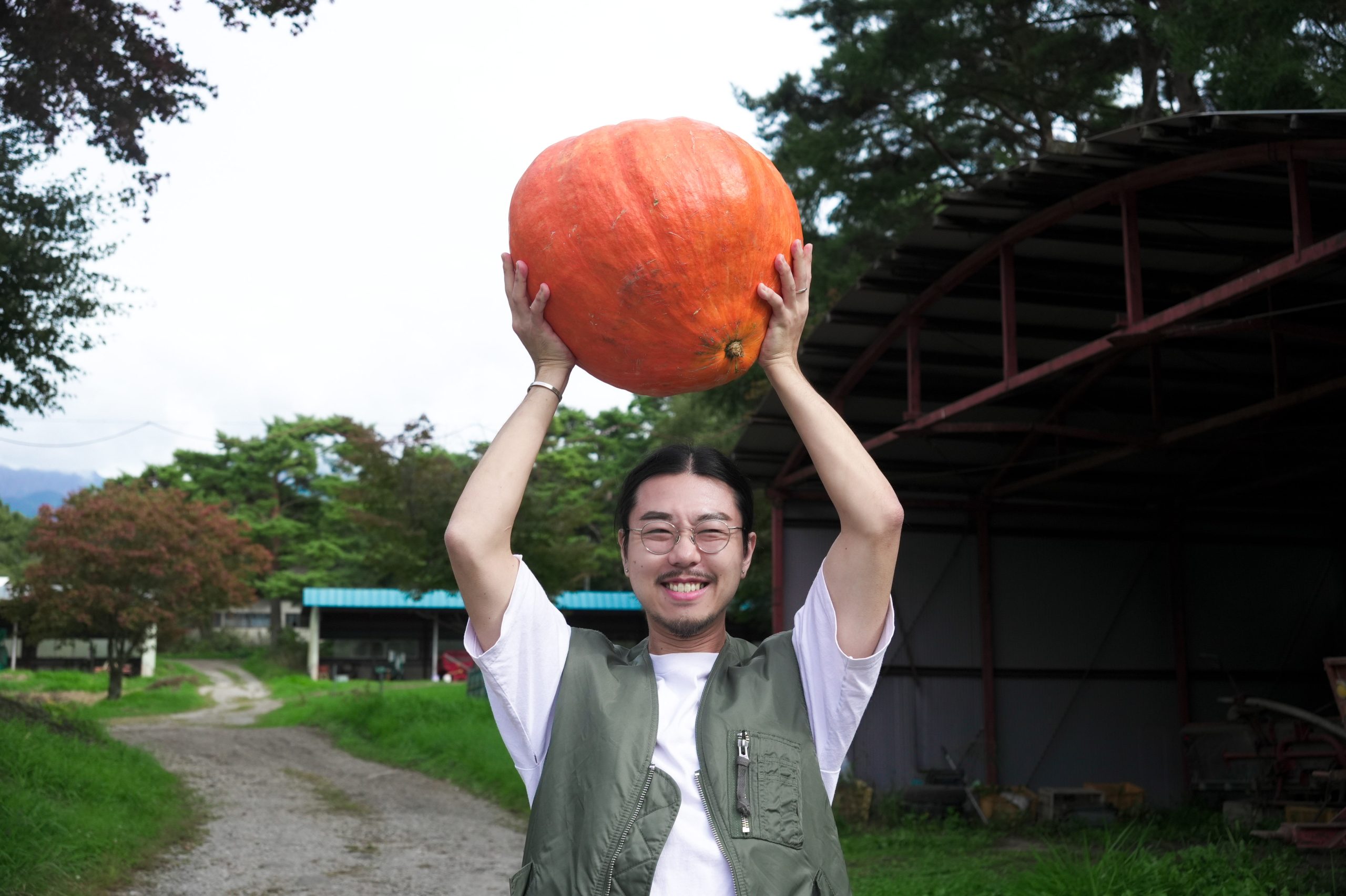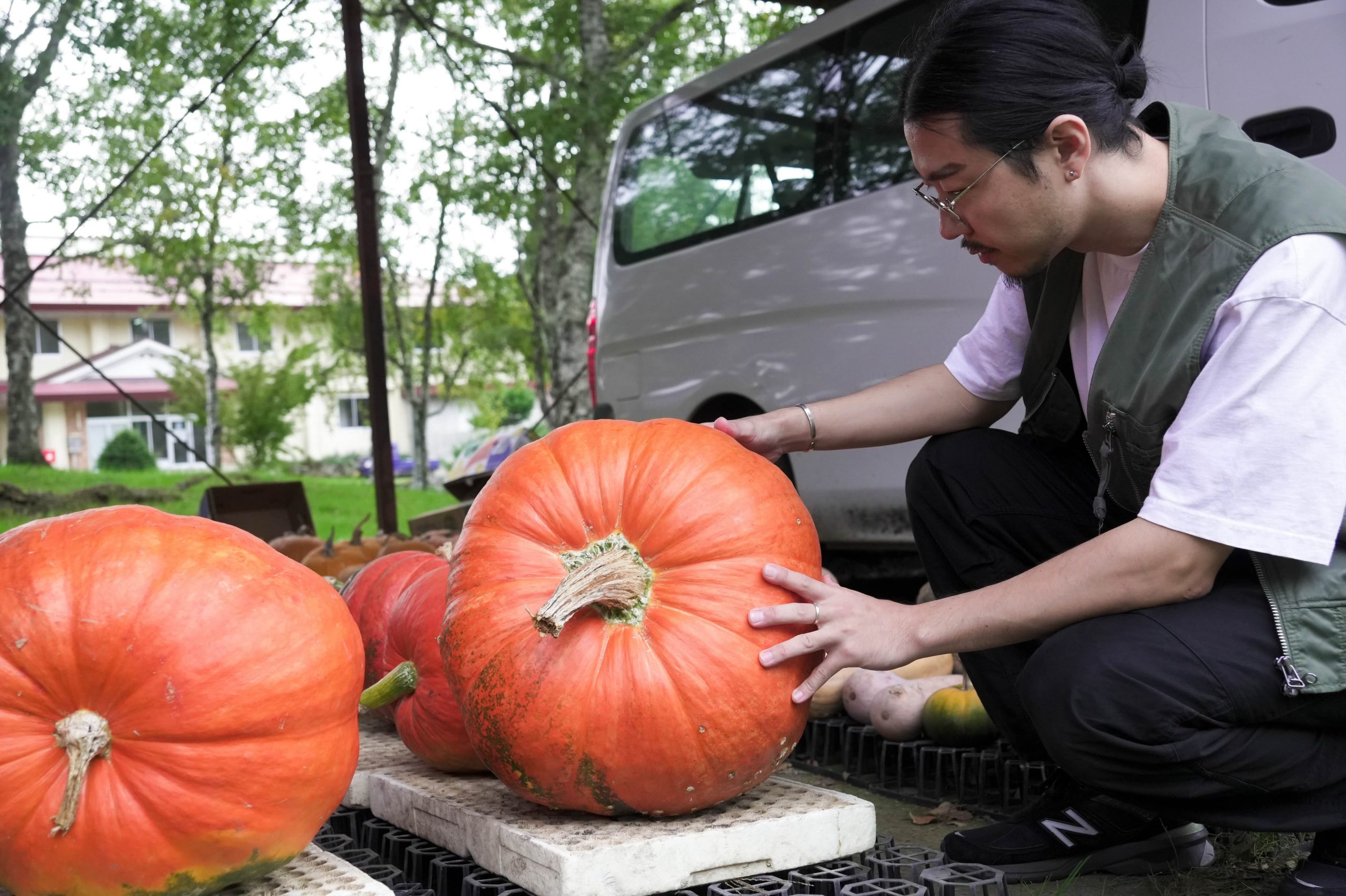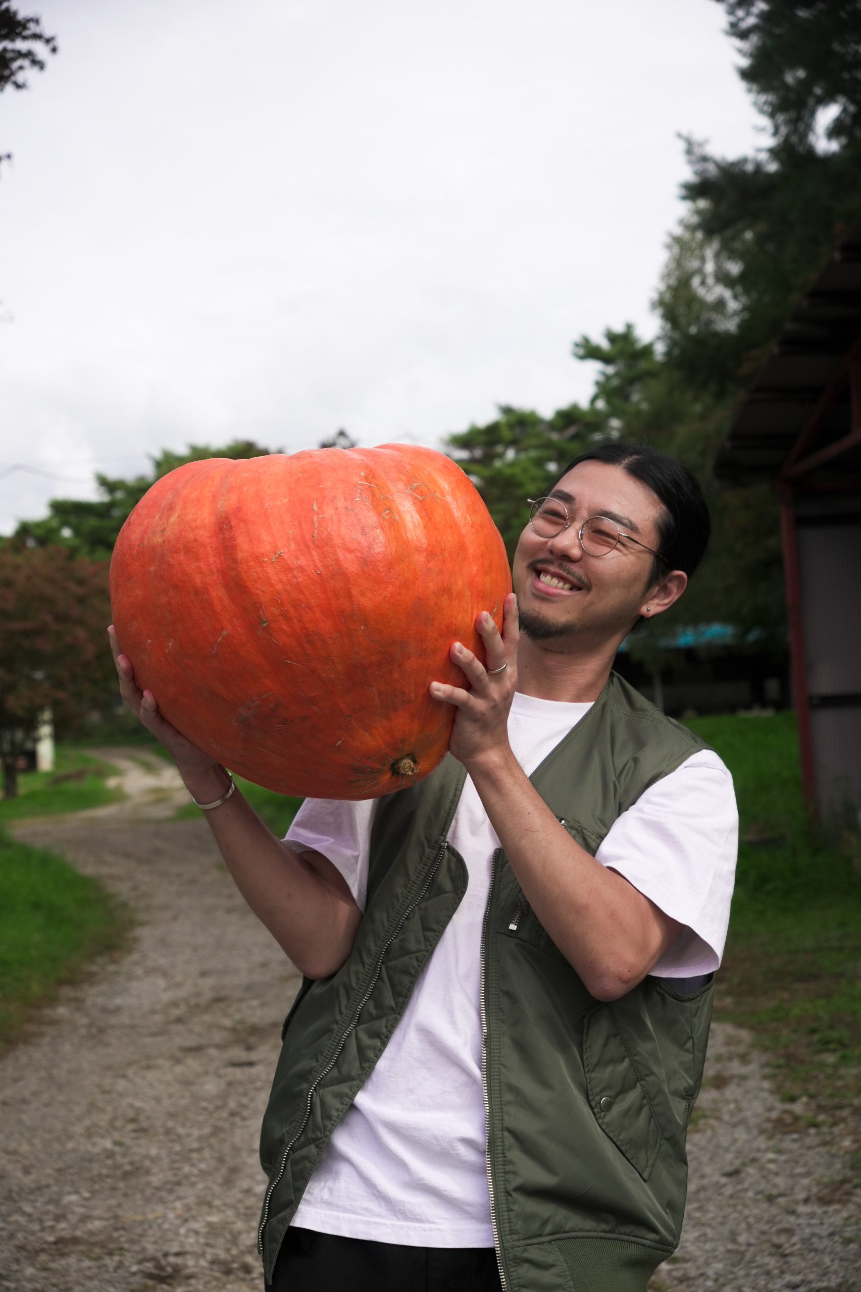 八ヶ岳まで行ったのはutataneの支配人溝江さん。八ヶ岳まではおよそ2時間半。天気にも恵まれ、カボチャ収穫日和です!