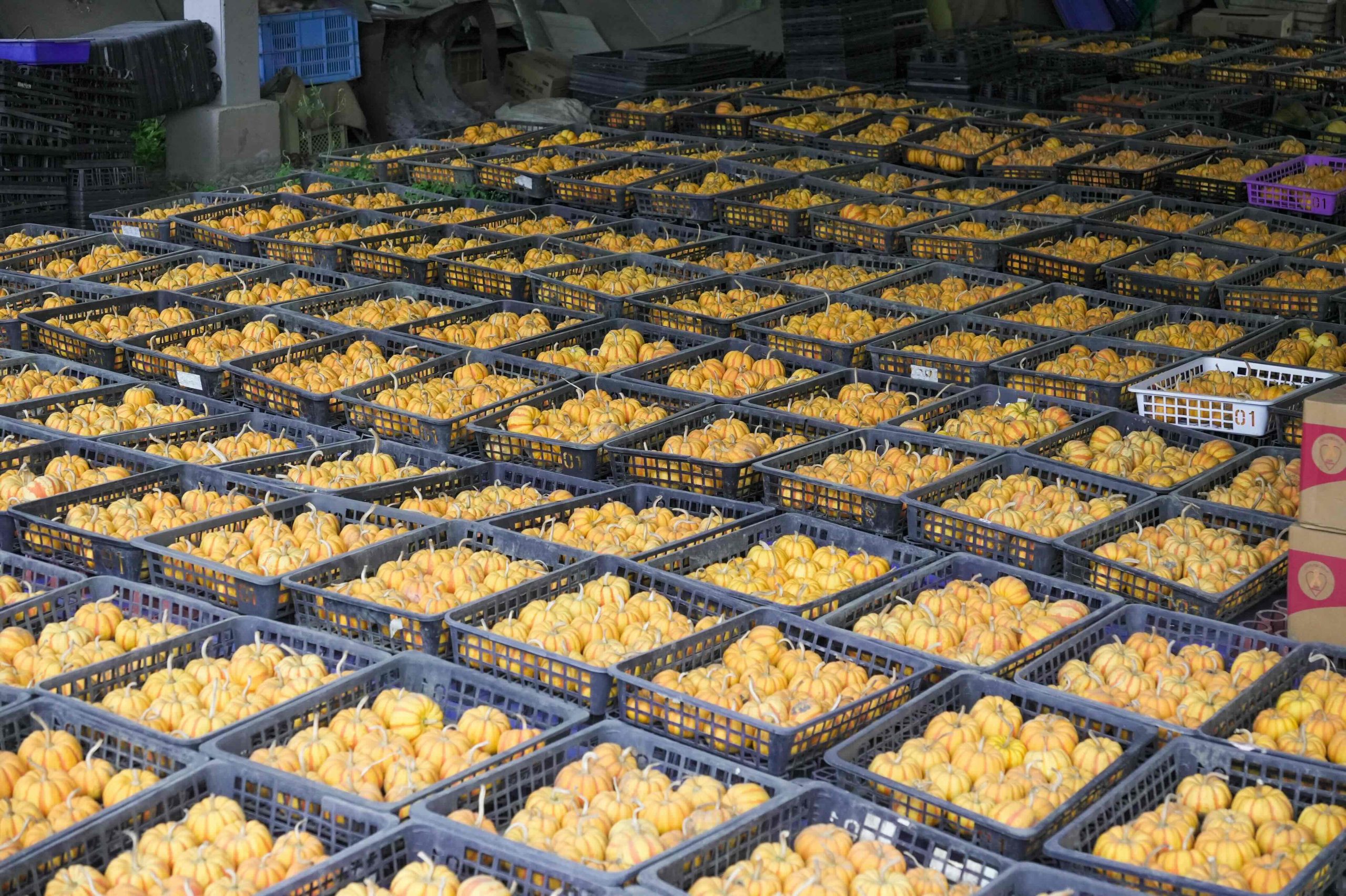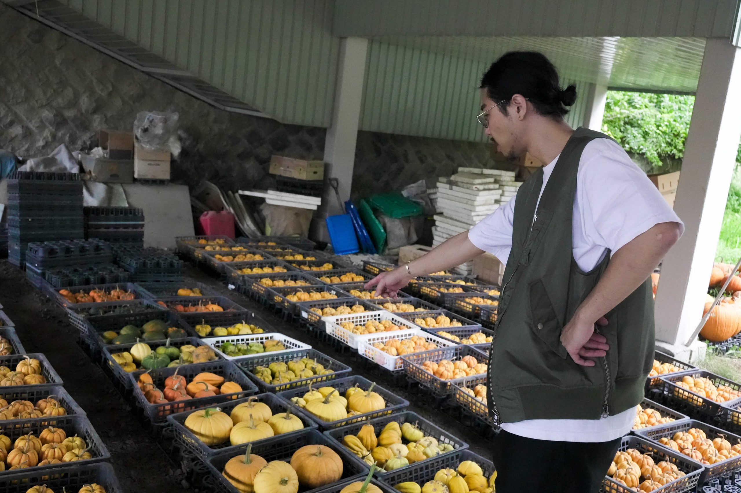 まずは小さいカボチャ達とご対面。丸い子もいれば、平らな子も…白いカボチャもあります。どのカボチャも個性豊かでかわいい。早速、どのカボチャをお持ち帰りするか悩み中の支配人。カボチャ選びに本気です。