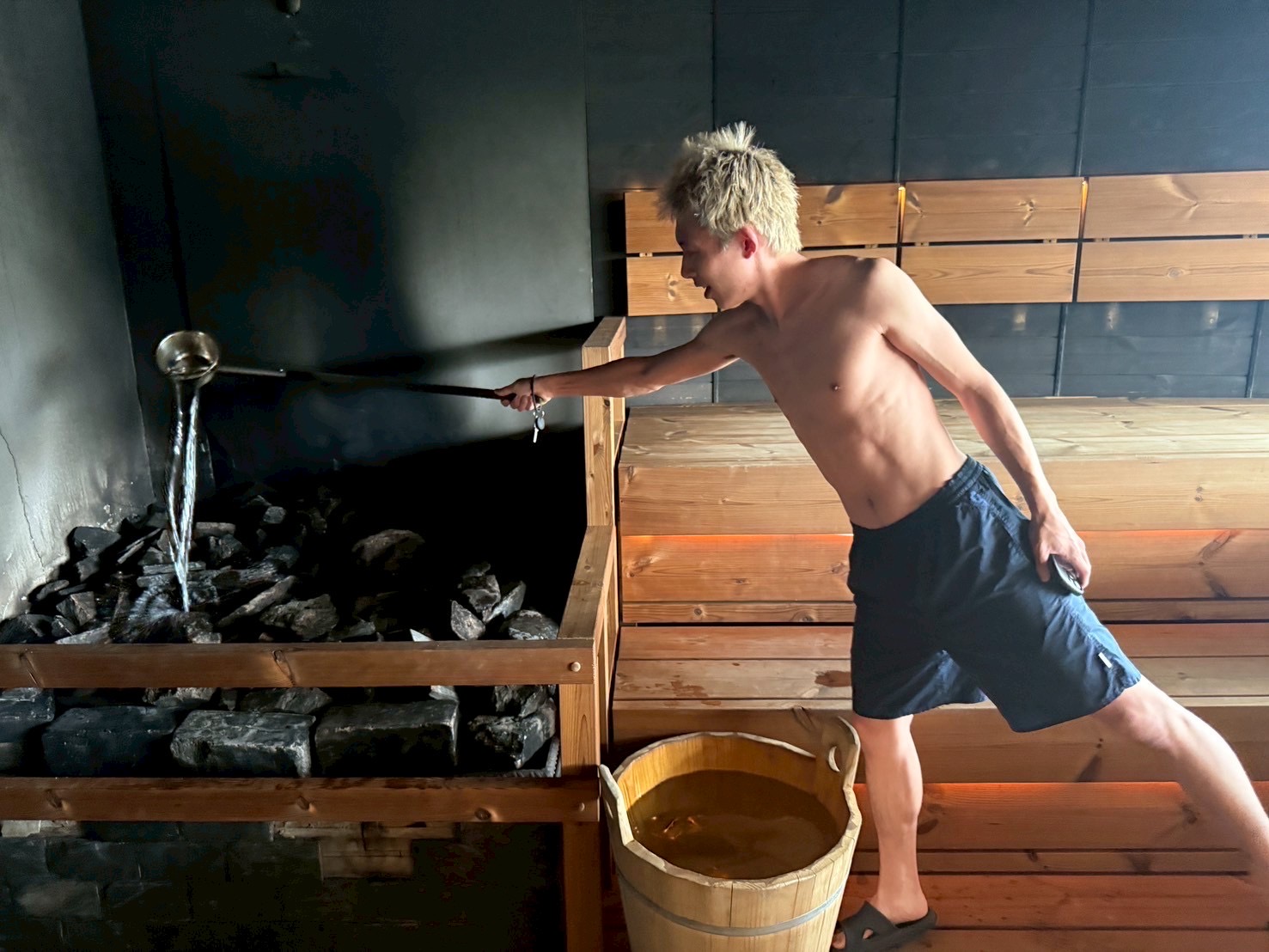 フィンランドのサウナは基本自分たちでロウリュをします。スタッフがするのでもなく、自動でもない。桶の水は、スタッフが汲みに来ません。「この勢いでかけてたら10分で無くなるわ!!!」と思って見ておりましたが、体格の良い現地のおじさんが席を立ち、外のシャワーで水を汲み戻ってきました。