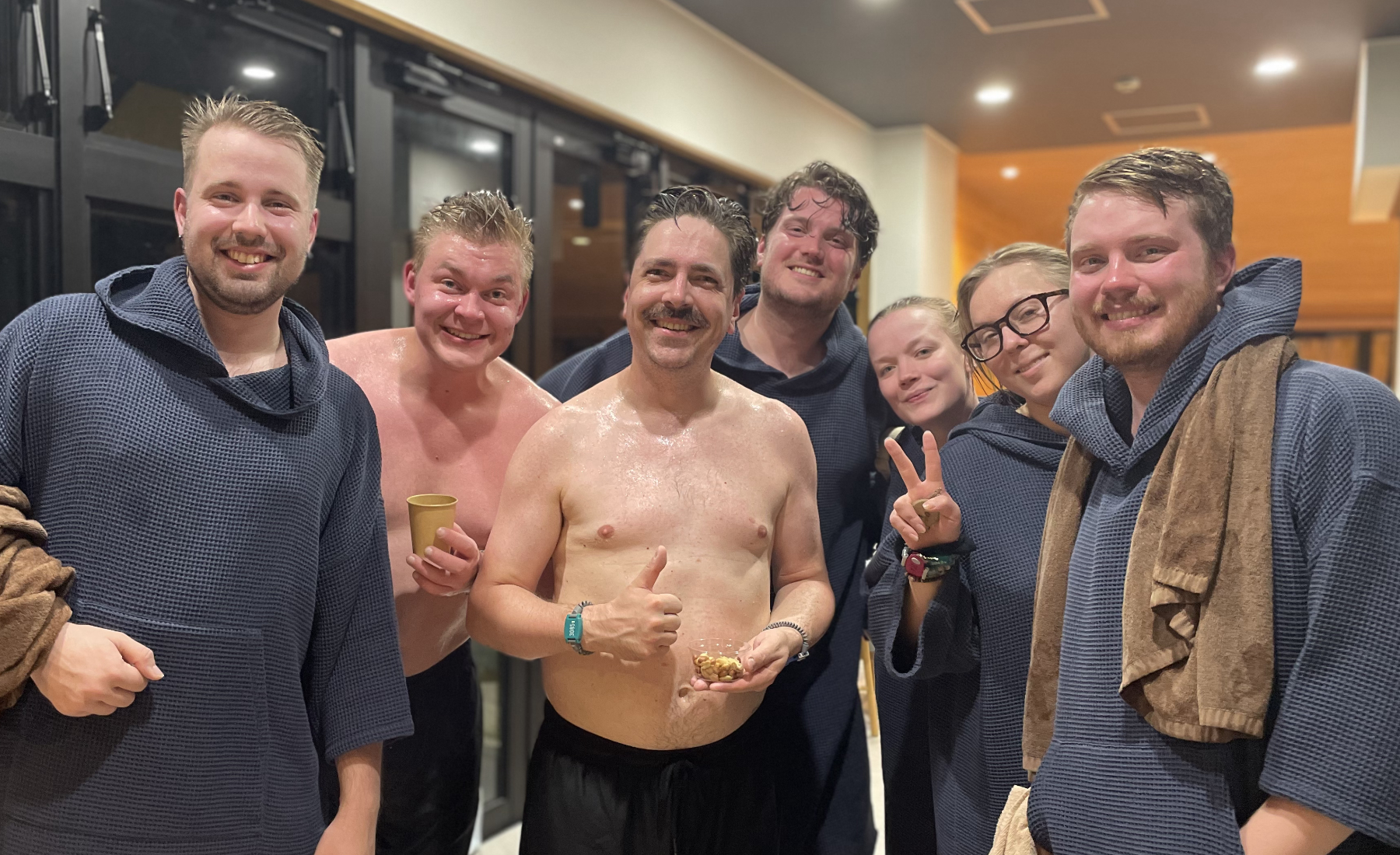 ホテルに荷物を置くと、さっそく温泉とサウナへ。あげき温泉にはフィンランドをテーマとした「サウナラウンジ Serow」があり、その空間へ20名超のフィンランド人がぞろぞろと入っていく様子は、まさに本場のフィンランドのようです!