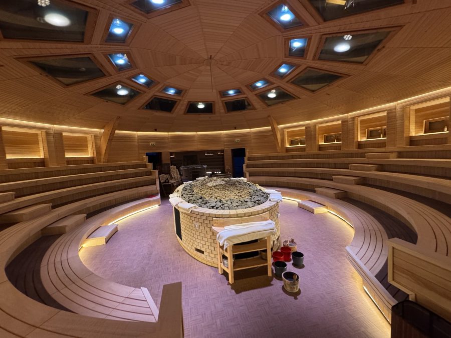 サウナ室の中にはプロジェクターや音響があちこちにあり、ライティングに至っては、天井はもちろん床にも埋め込まれていました。真ん中には大きなサウナストーブが鎮座しており、あげき温泉の一番大きいサウナストーブのざっと10倍はある大きさだったと思います。