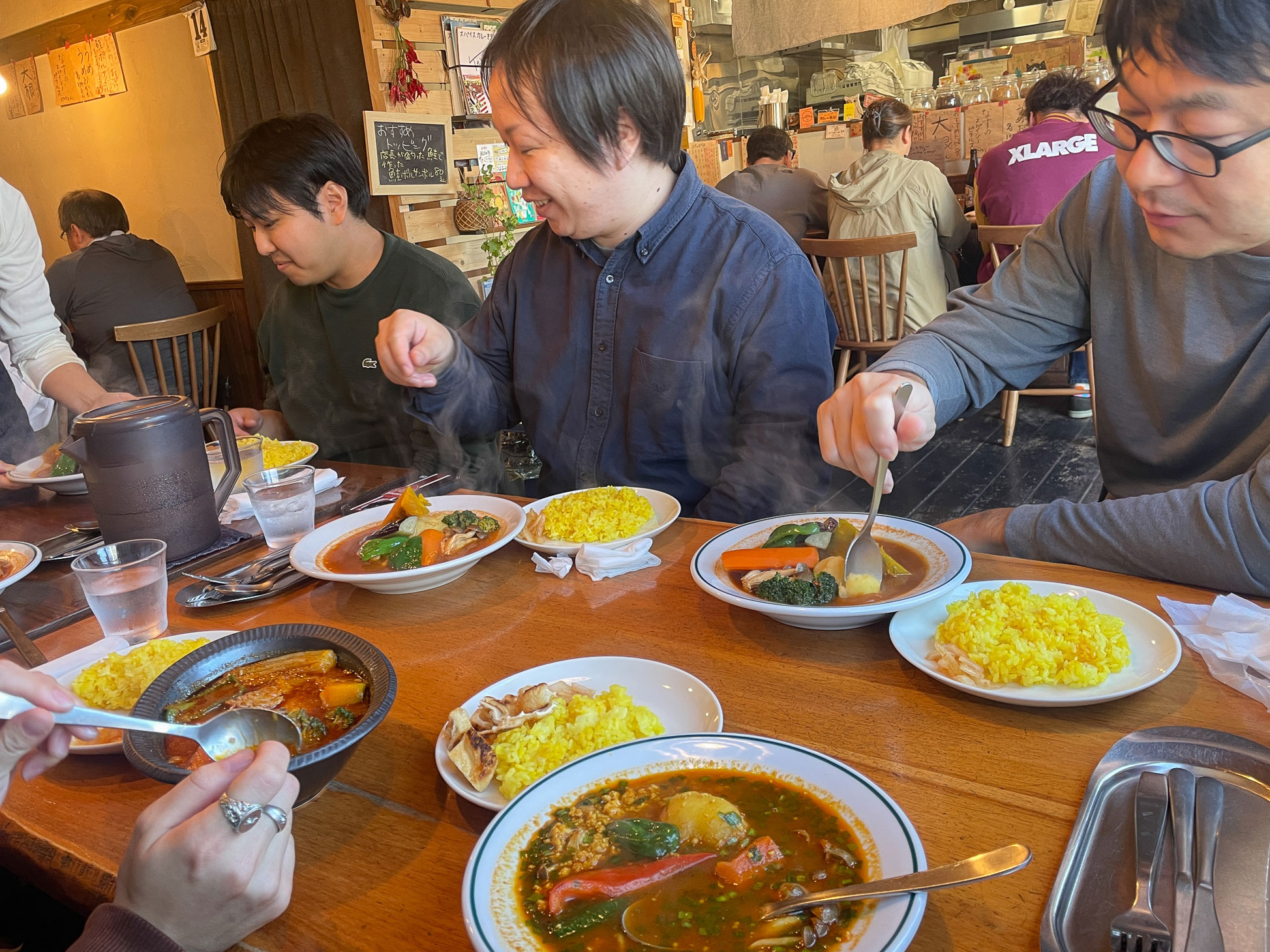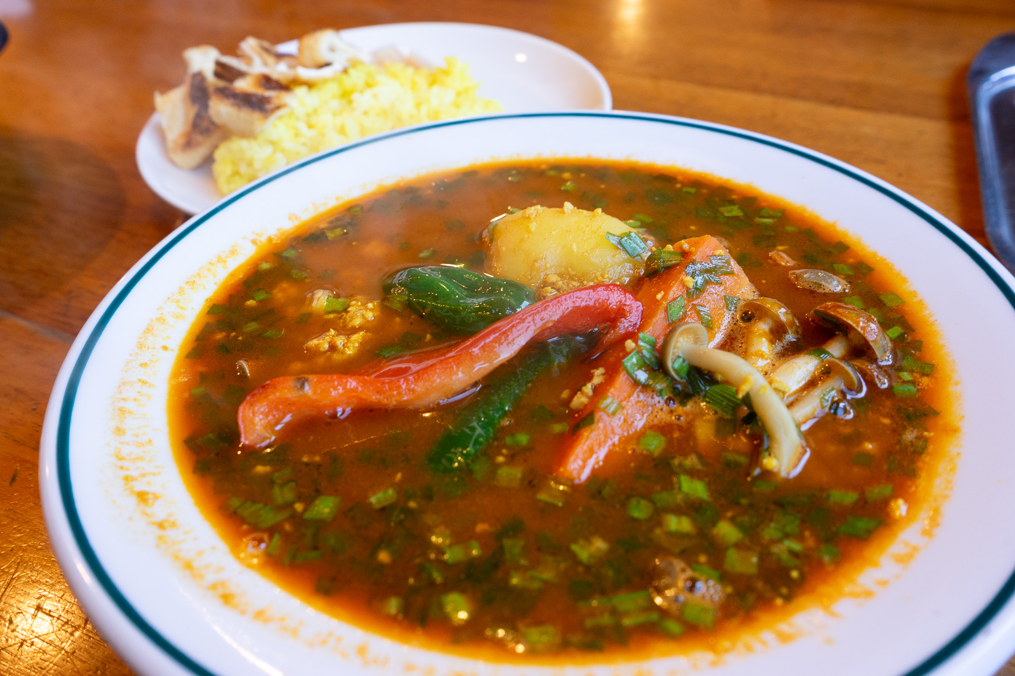 地元のおじいちゃんおばあちゃんから観光客まで幅広く人気で、開店前から行列ができておりました。私は限定の「ニラキーマお揚げサクサクスープカレー」をいただきました。白い平皿に炊き立ての野菜がゴロゴロと。