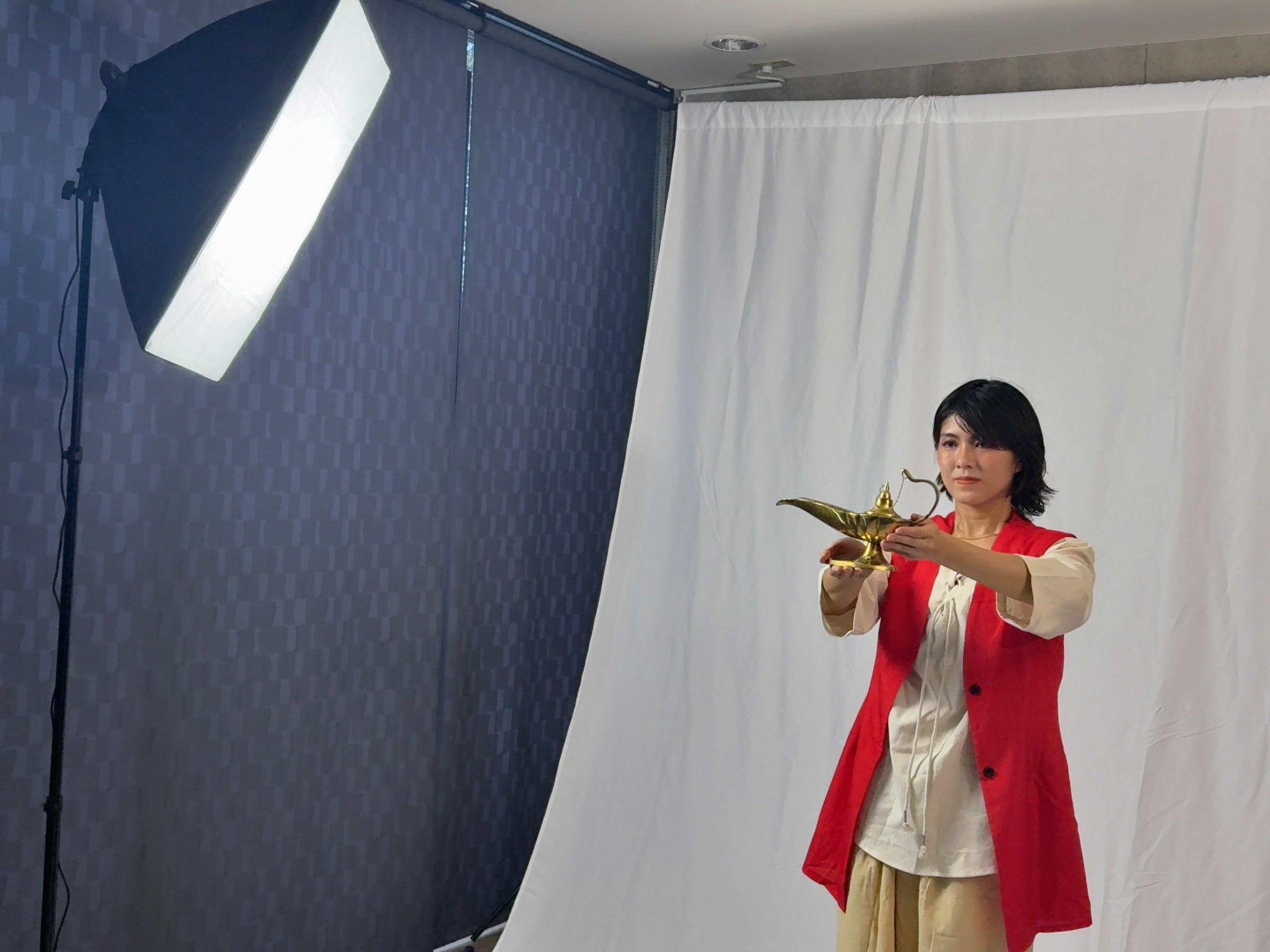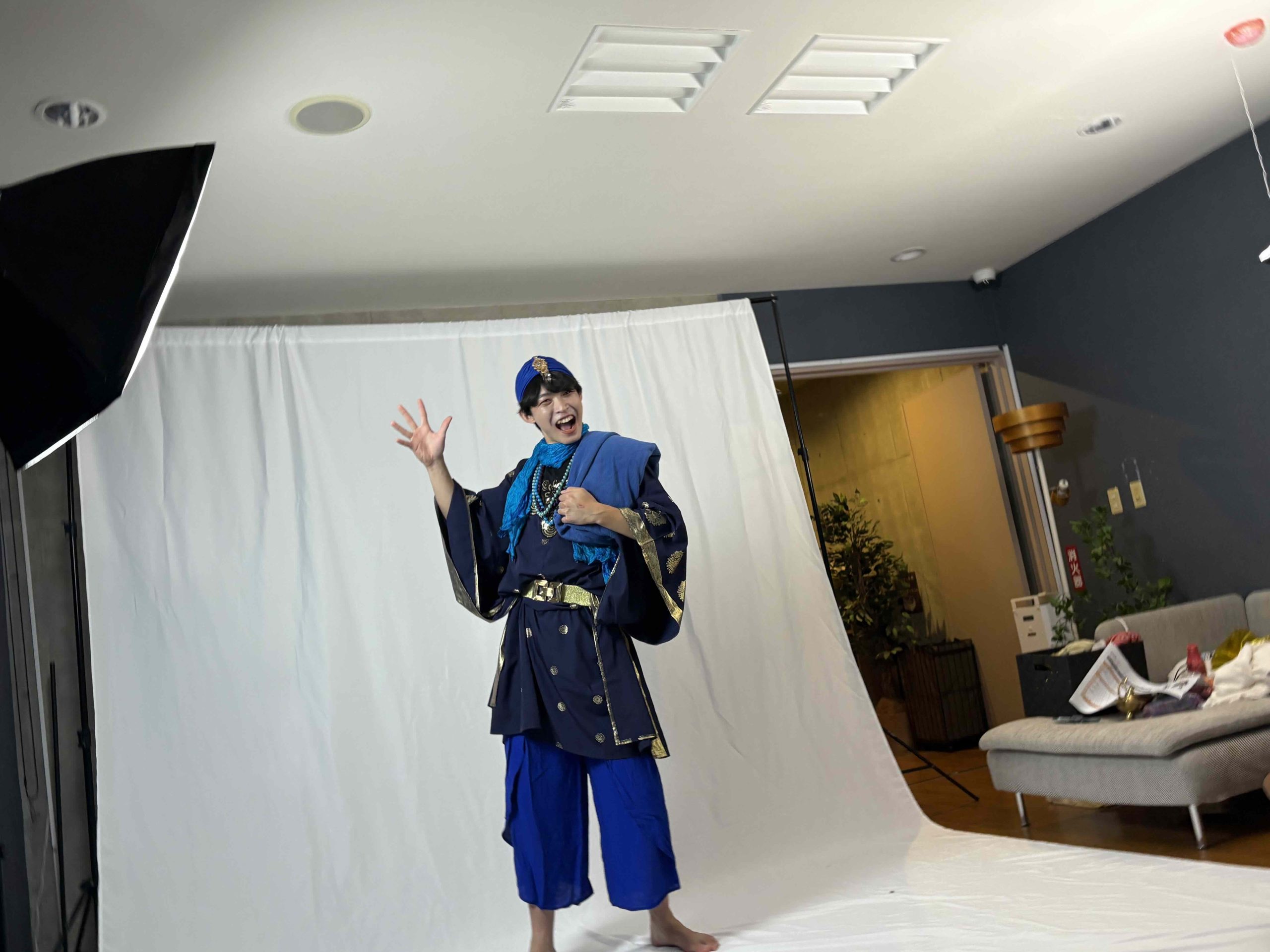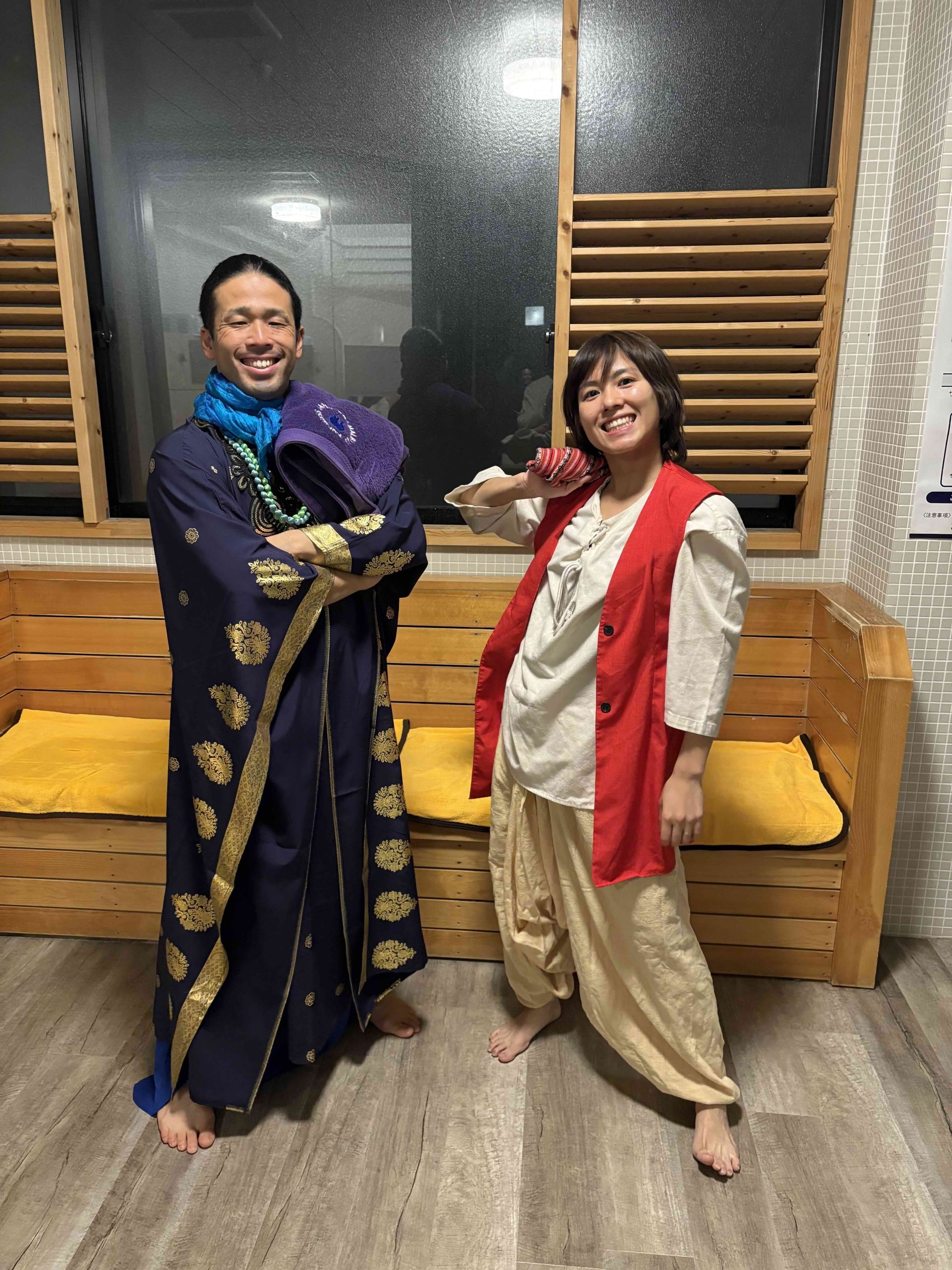 アラジンと魔人ジン。二人の個性を出しつつ、サウナの熱気でも重たくならず、激しいパフォーマンスを妨げない素材を厳選しました。実は、小道具の一部は海外で直接買い付けてきた一品だったりします!