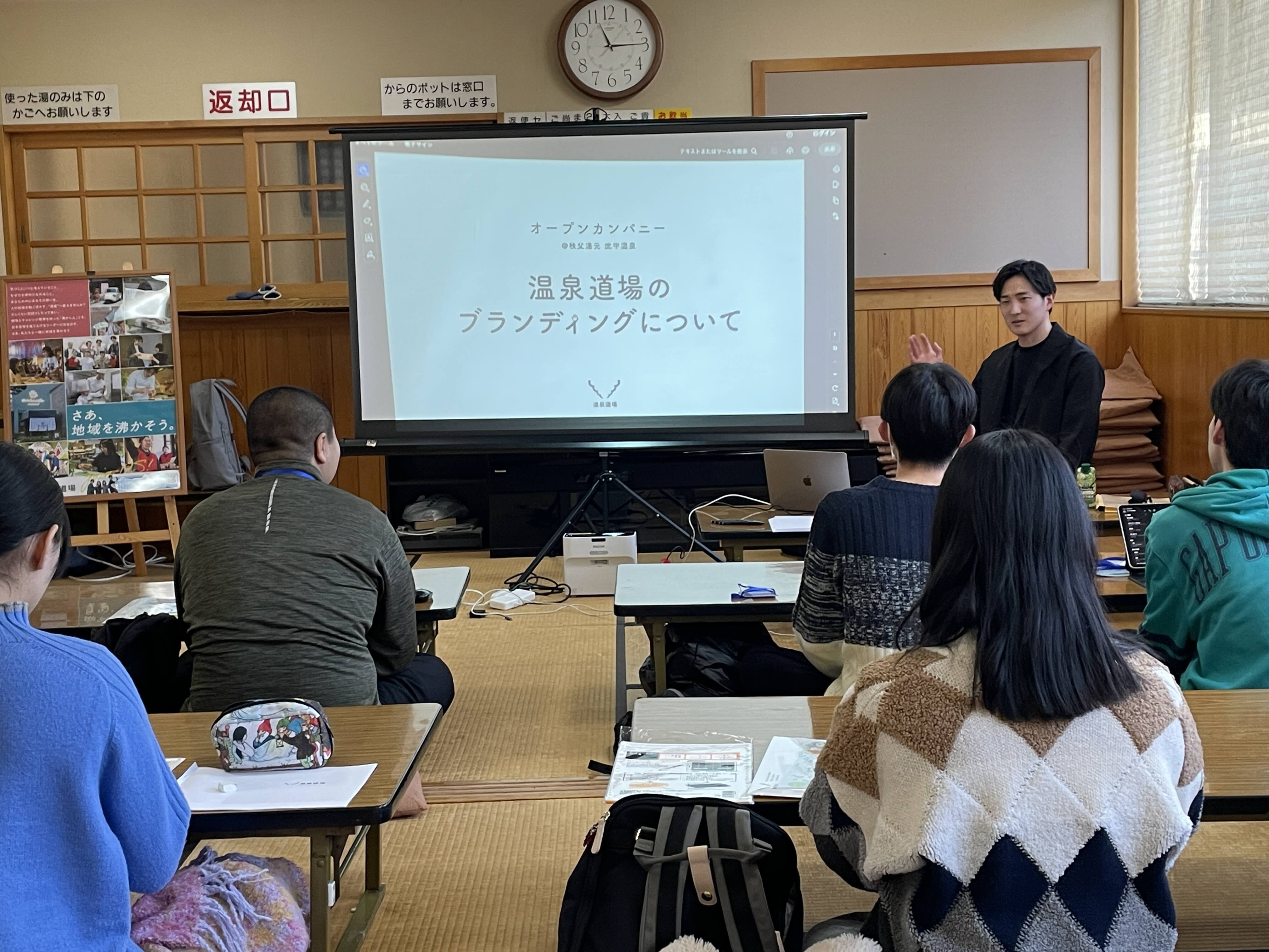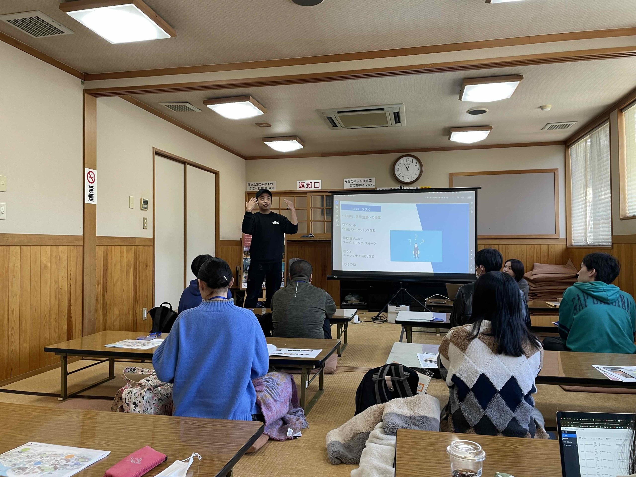 まずはじめに、武甲温泉支配人の鶴見さんが今回の舞台である武甲温泉についての講義を行いました。創業の背景や施設のコンセプト、現在提供しているサービスなど、さまざまな角度から地域を沸かすためのアクションについてご説明しました。