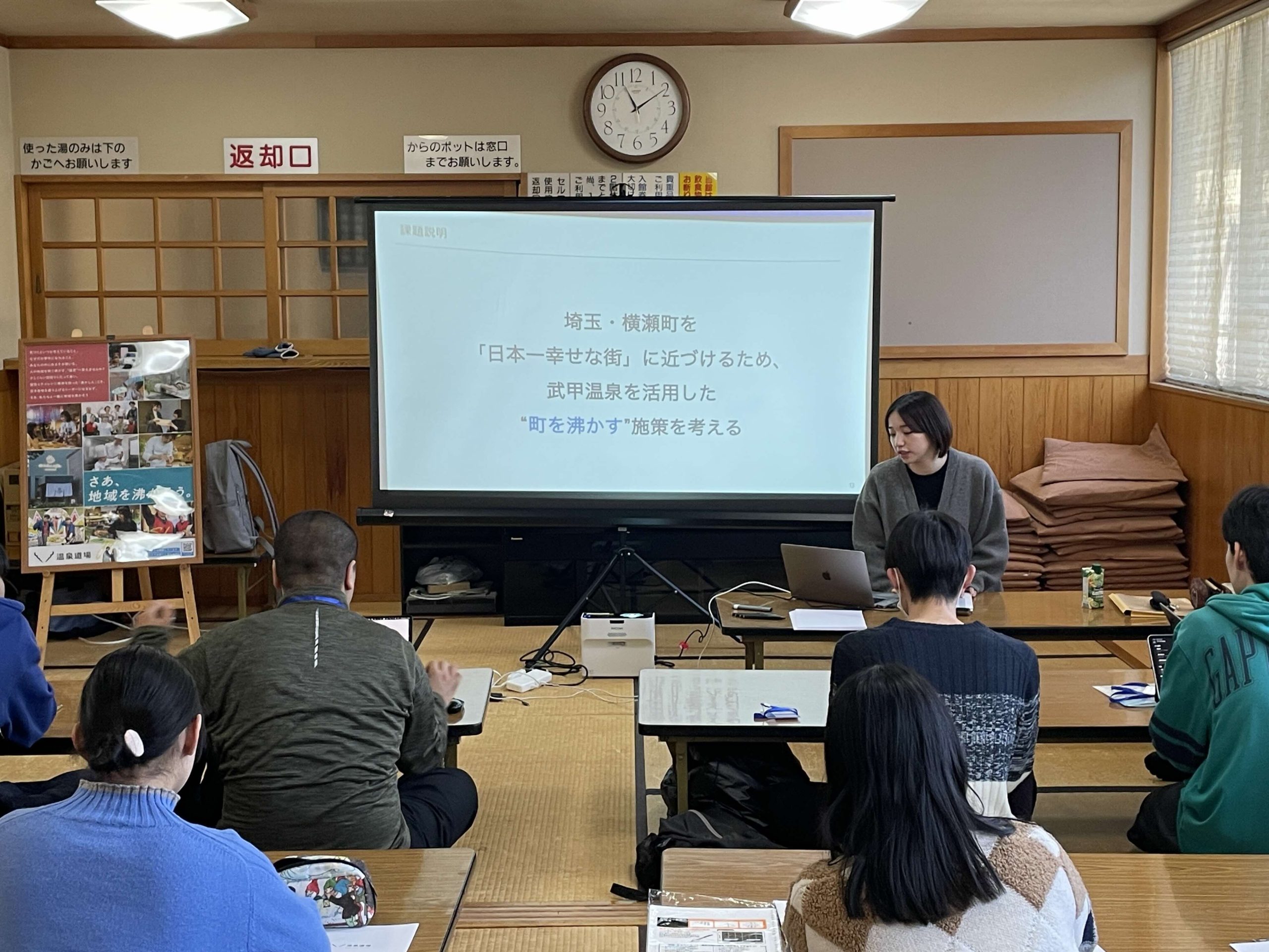 今回のプログラムでの課題は「埼玉・横瀬町を日本一幸せな街に近づけるため、武甲温泉を活用した“町を沸かす施策”を考える」。3チームに分かれて、店舗を起点とした企画やイベント、課題改善案を考えていただきました。