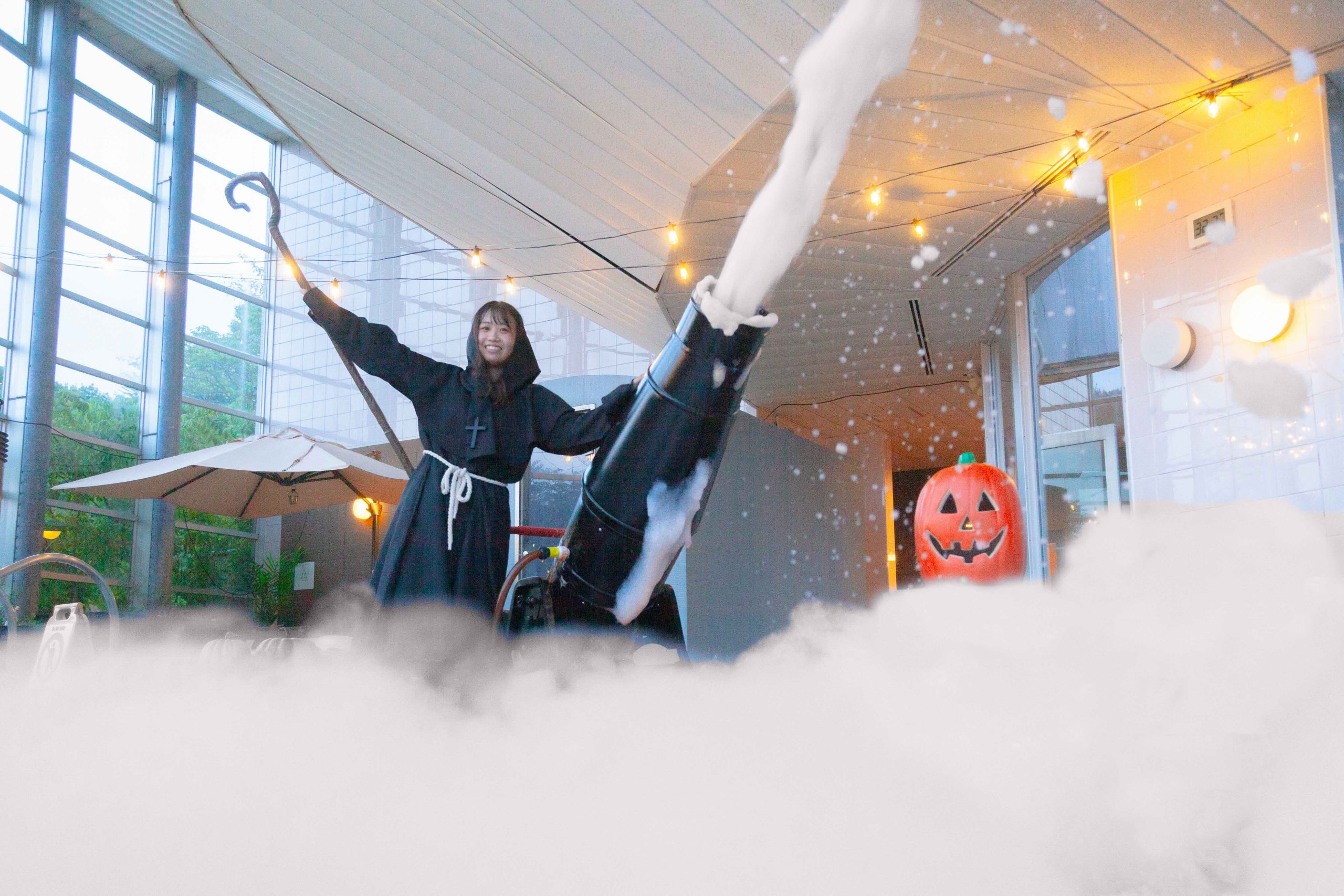 大人気なイベント「泡バズーカ」をハロウィン期間は魔女が操ります。魔女がまぜる壺には、ふしぎな色の液体が……。何色の泡バズーカがでてくるかは参加してからのお楽しみ。子供から大人まで、一緒に楽しめるイベントです。