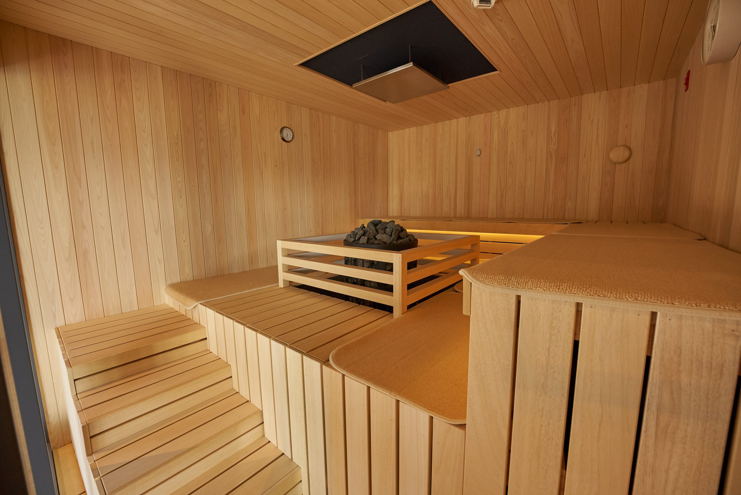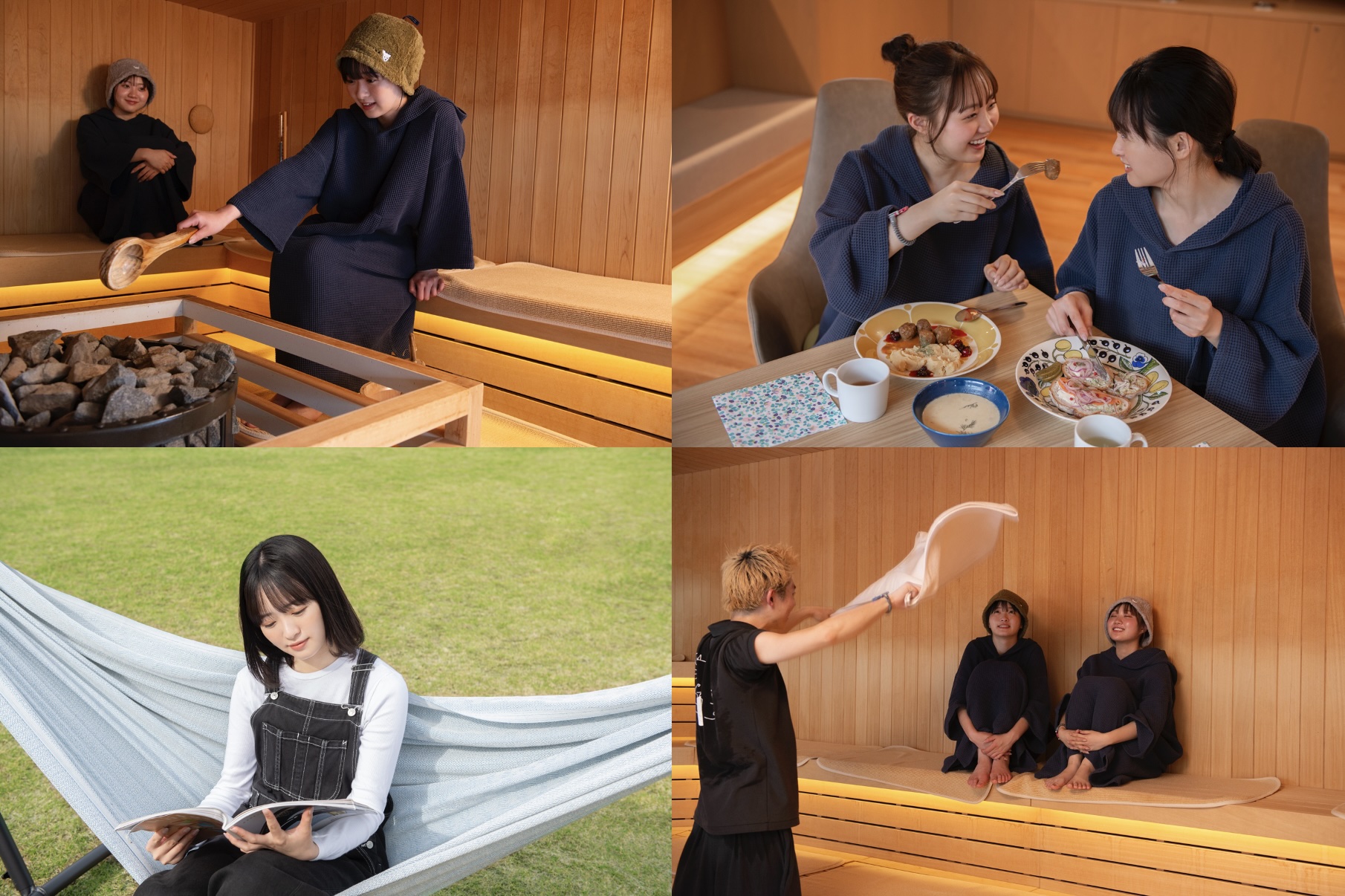 北欧のサウナの楽しみ方から着想を得た3種類のサウナを、水着着用で男女一緒に楽しむことができます。中庭デッキでは、外気浴や井戸水を使った水風呂も。屋内のラウンジエリアでは、内気浴やフリードリンク、書籍などをゆったりとお楽しみいただけます。