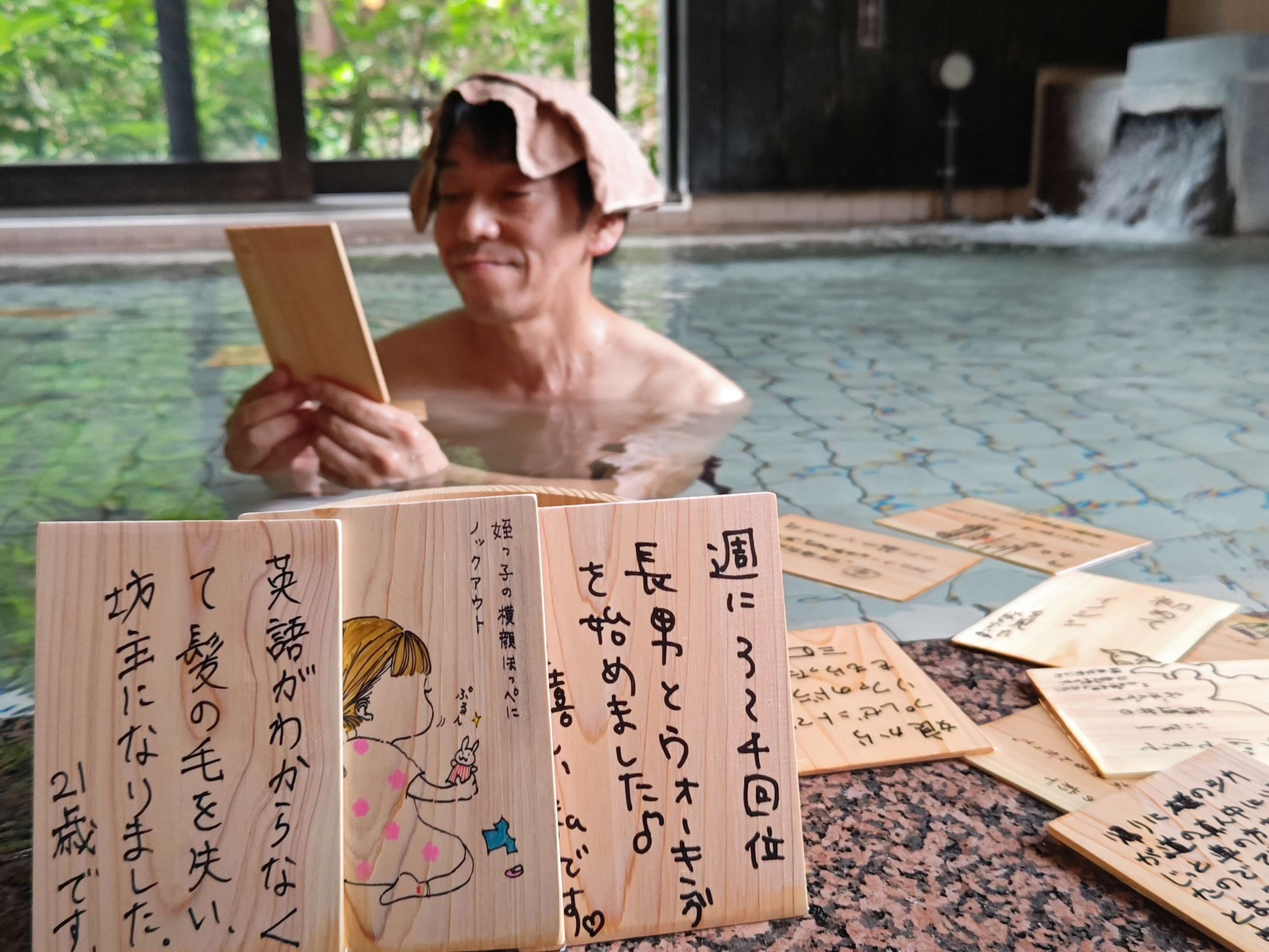 玉川温泉では、従業員だけでなく地元の商店を中心に最近のニュースを書いてもらったヒノキ新聞も一緒に浮かべます。