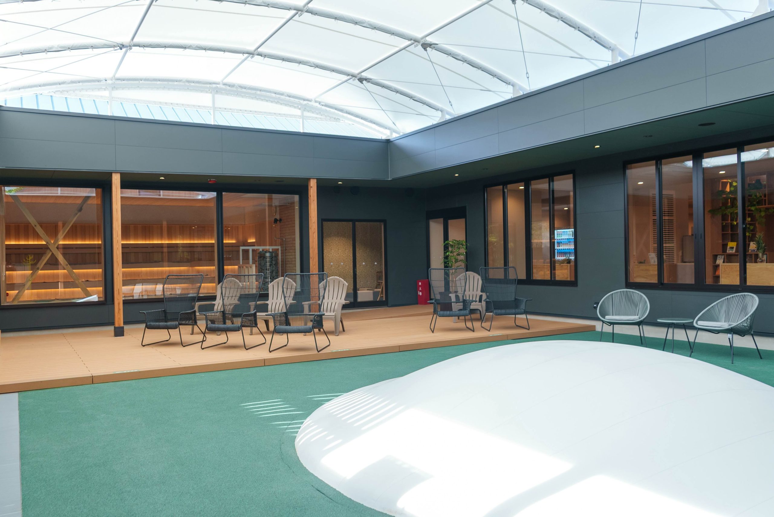 男女共用のサウナを有した中庭空間。館内着で楽しめる大型サウナ室にはフィンランドHARVIA社製のサウナストーブを設置。毎日、熱波パフォーマンスやアウフグースを開催します。また、ガーデンの中央にはトランポリンのように飛び跳ねる「ふわふわドーム」を用意し、お子さまが楽しんでいる姿を、サウナから見守ることができます。