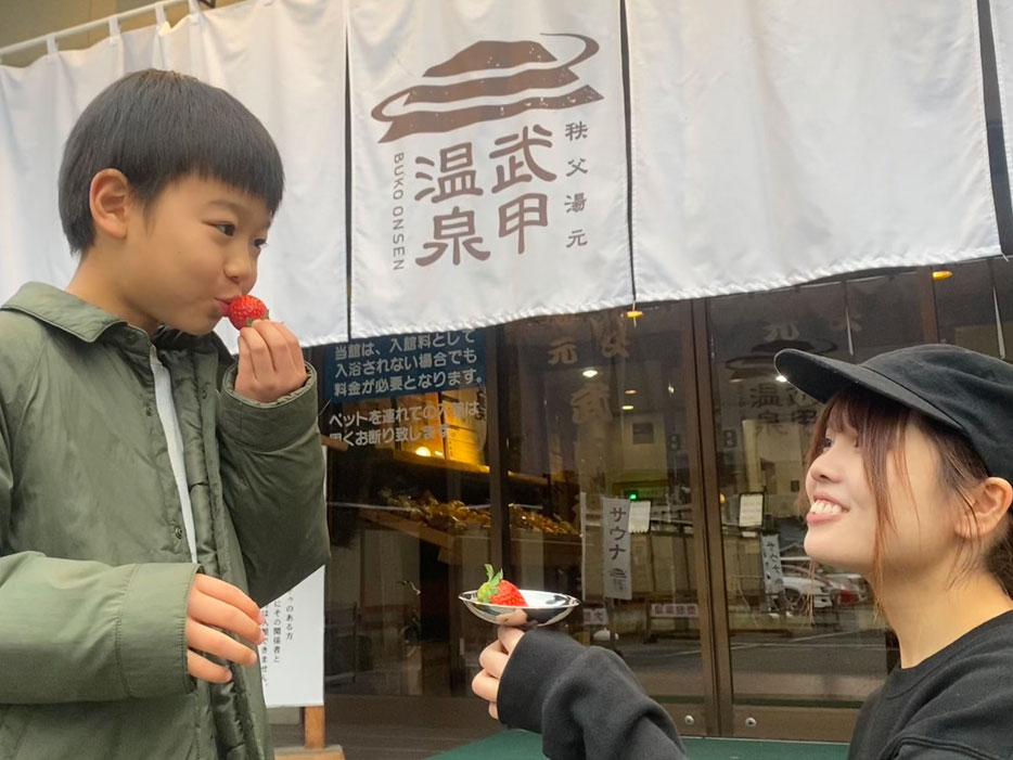 武甲温泉を訪れる限定150名さまに秩父のいちごを一粒プレゼント。午後1時15分以降のご入館が対象です。