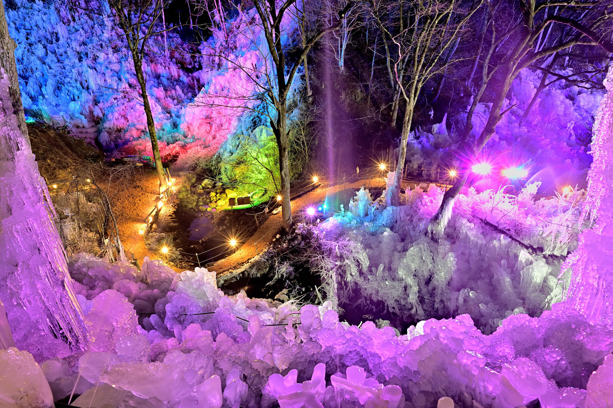 寒さが厳しい冬に出会える氷の光景。高さ30m/幅200mにわたって、壮大な氷の世界が広がります。芦ヶ久保駅から徒歩10分で、会場内すぐそばを電車が通るため、電車の車窓から氷柱を望むことができます。週末の夜にはライトアップされ、色とりどりに変化するその幻想的な空間は、自然の中の宝石箱のような輝きを放ちます。