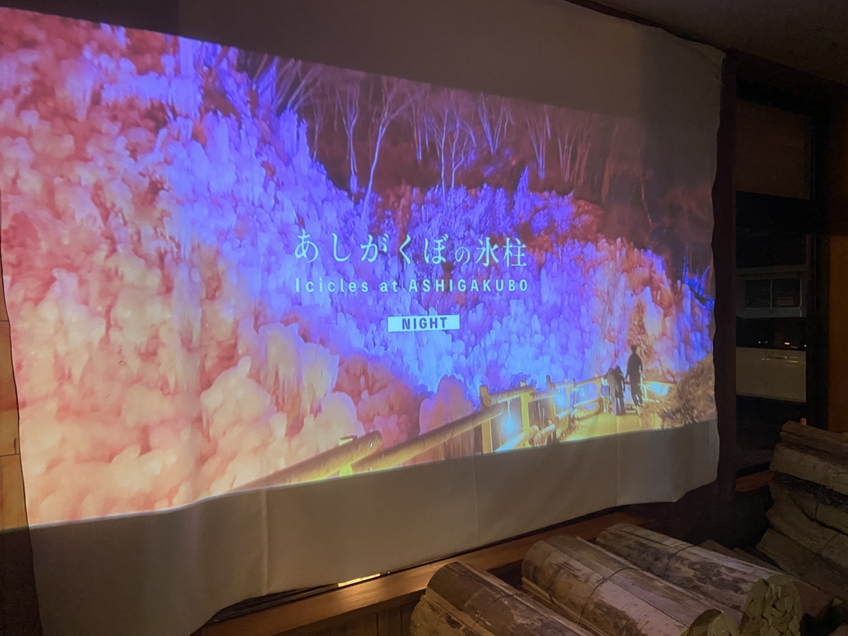 武甲温泉の本館入り口にて、あしがくぼの氷柱動画を流してお出迎えします。