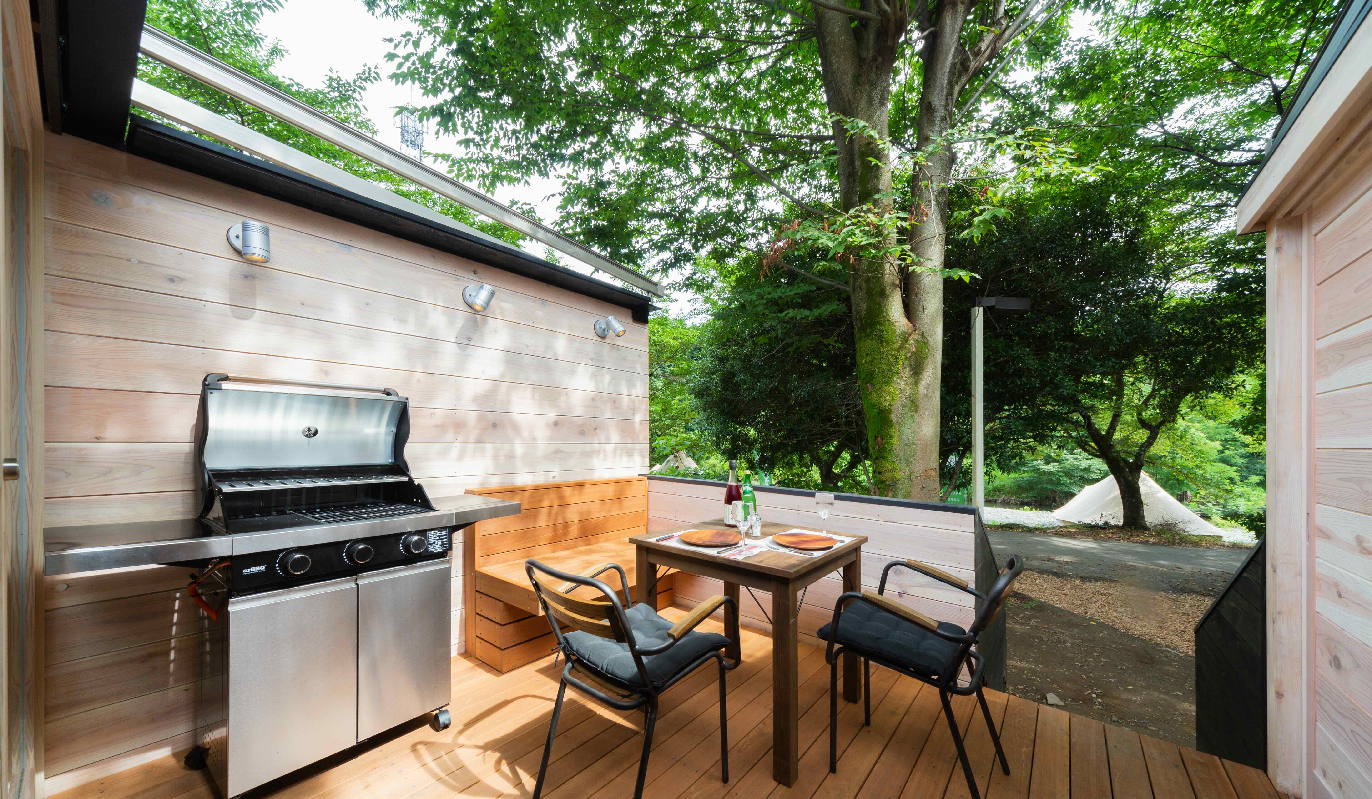 デラックスキャビンは、各部屋ごとにトイレやバスルーム、キッチンを備え、お部屋の前のプライベートデッキにはBBQグリルも完備しています。もちろん暖房も付いているので室内ではあたたかく過ごすことができます。新たに追加されるこだわりのアイテムや、埼玉県産のフルーツでこれまで以上に贅沢なひとときをお過ごしください。