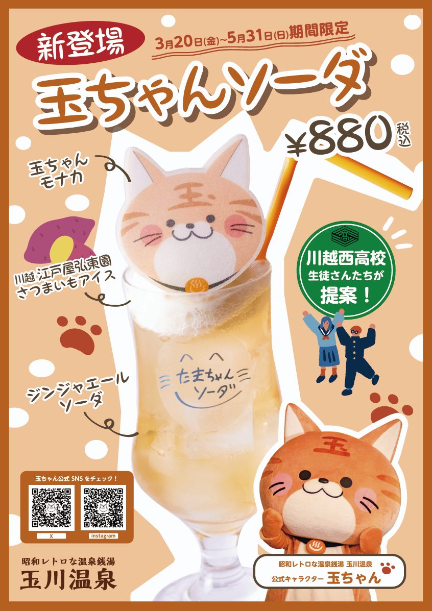株式会社温泉道場(埼玉県比企郡ときがわ町、代表取締役 山﨑寿樹)が運営する日帰り温泉・昭和レトロな温泉銭湯 玉川温泉(埼玉県比企郡ときがわ町)は、2026年3月20日(金)より新メニュー「玉ちゃんソーダ」を玉川食堂にて提供開始します。