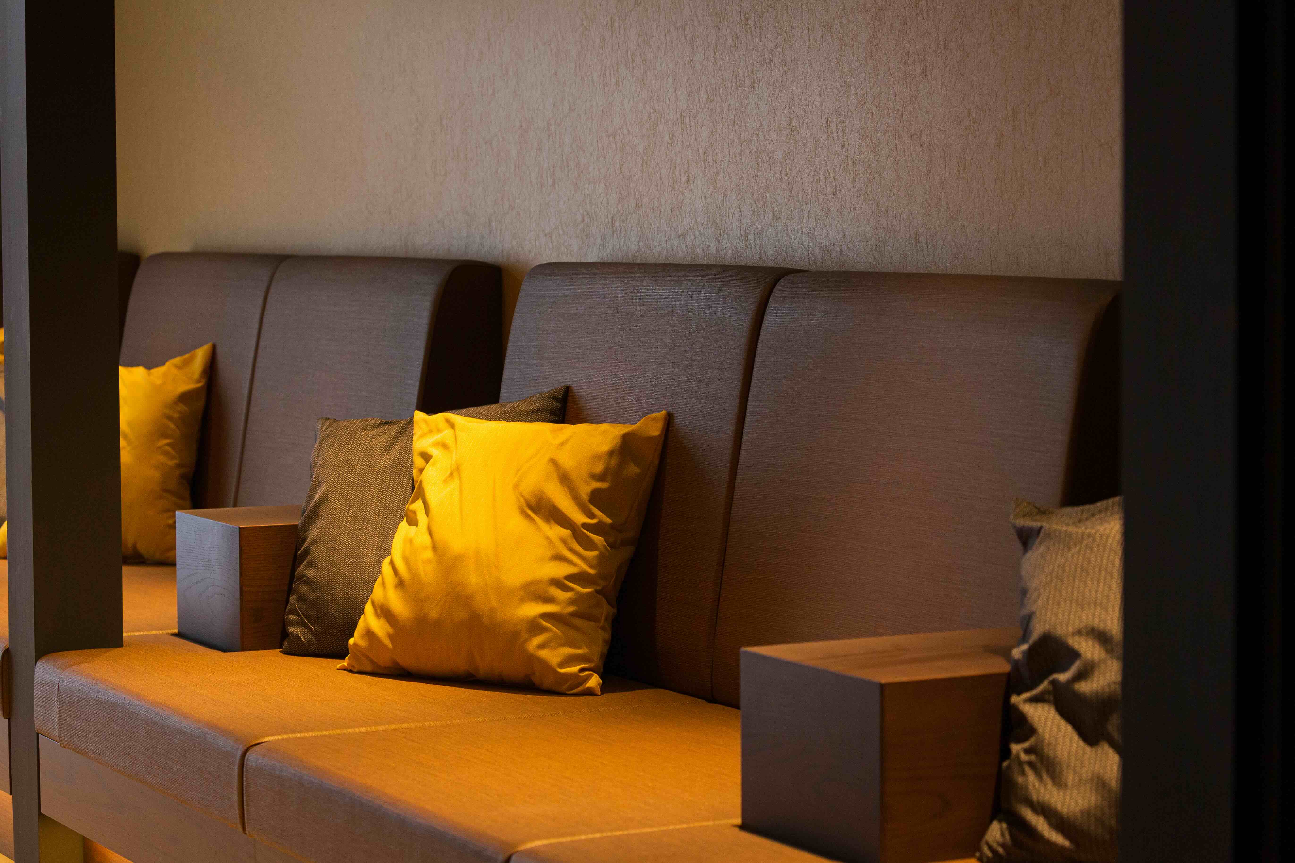 お風呂を出て目の前に広がる湯上り処。横になって身体を休められるリクライニングソファがあります。