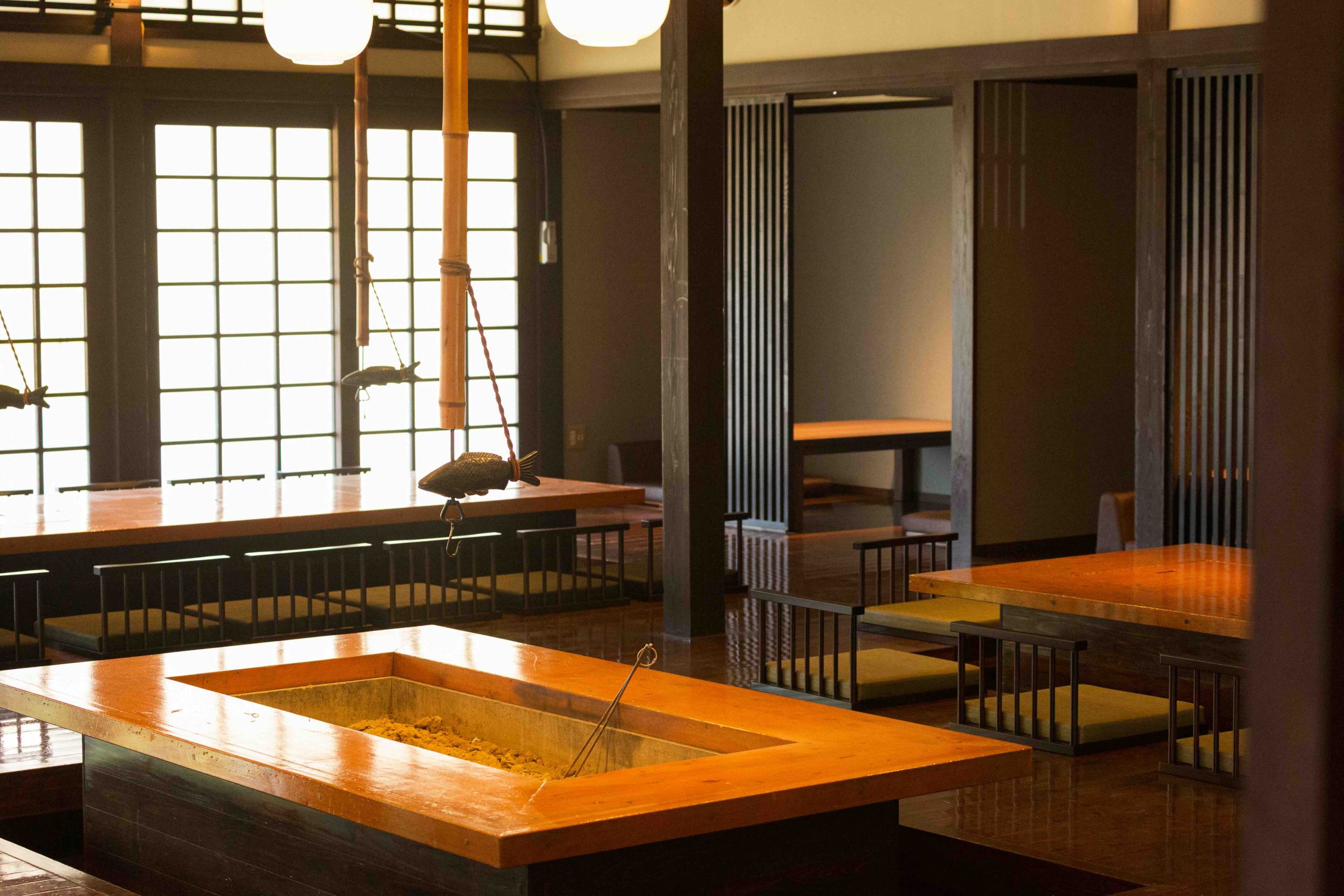 古民家を思わせる梁の高い天井と存在感のある囲炉裏が迎える食事スペース。「発酵」をテーマに、心と身体を整えるお料理を提供します。