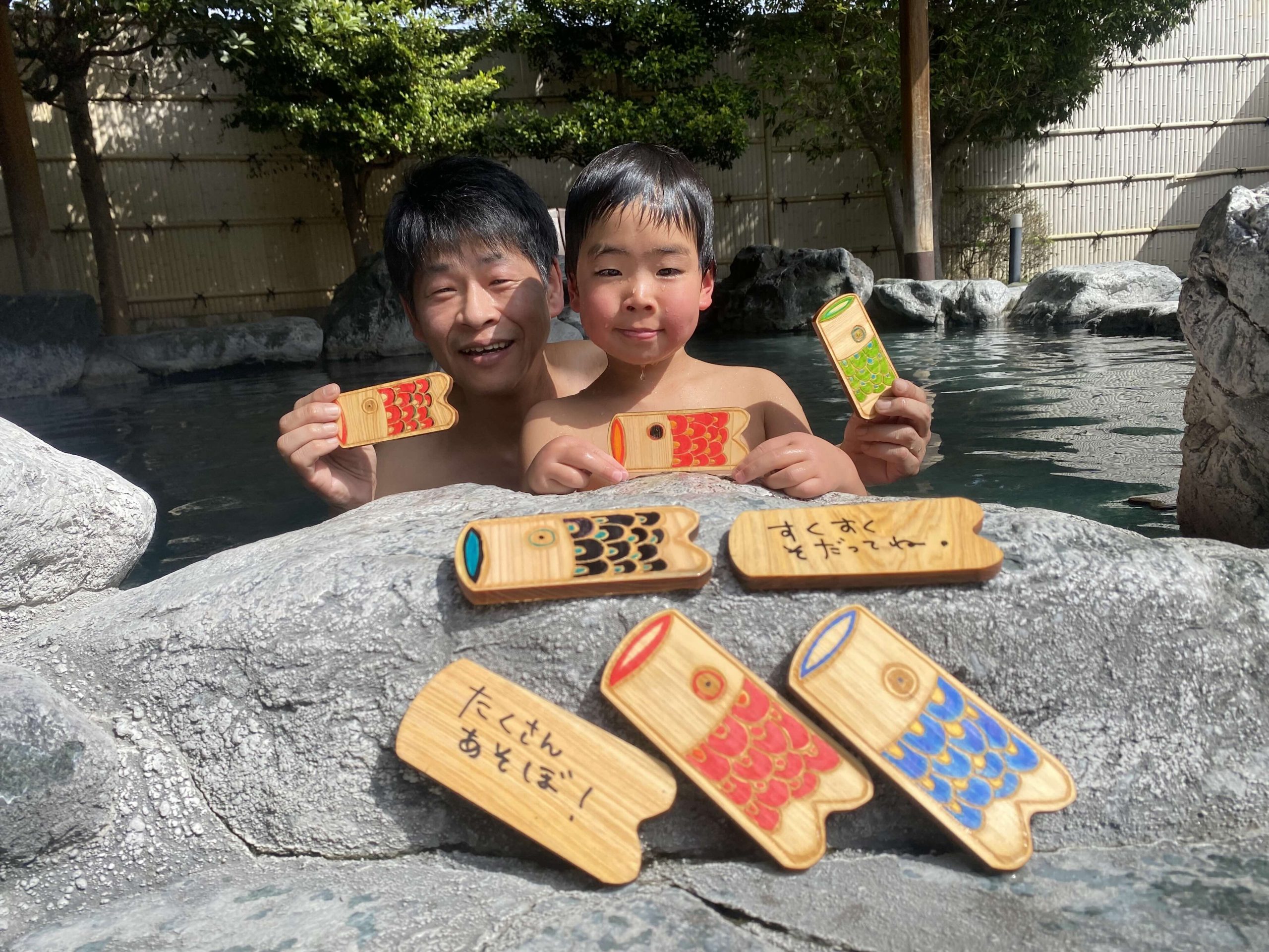 お子さまへ向けたメッセージを記入した、鯉のぼり型のヒノキがお風呂を泳ぎます。ヒノキの香りとメッセージをお楽しみください。