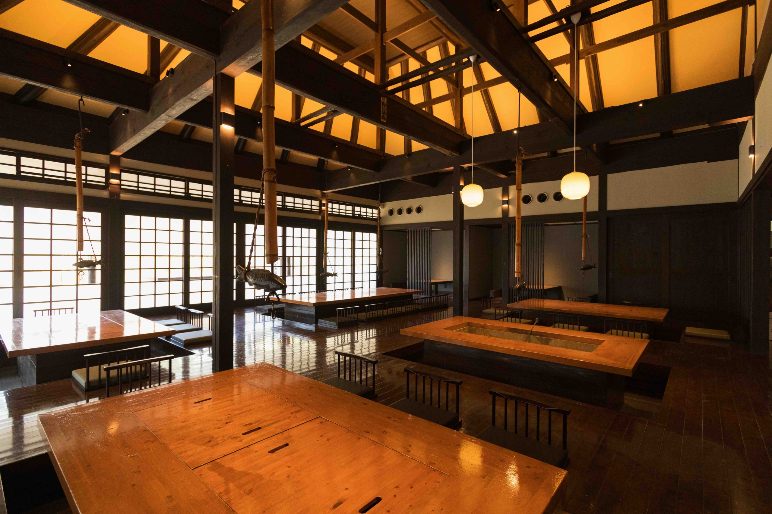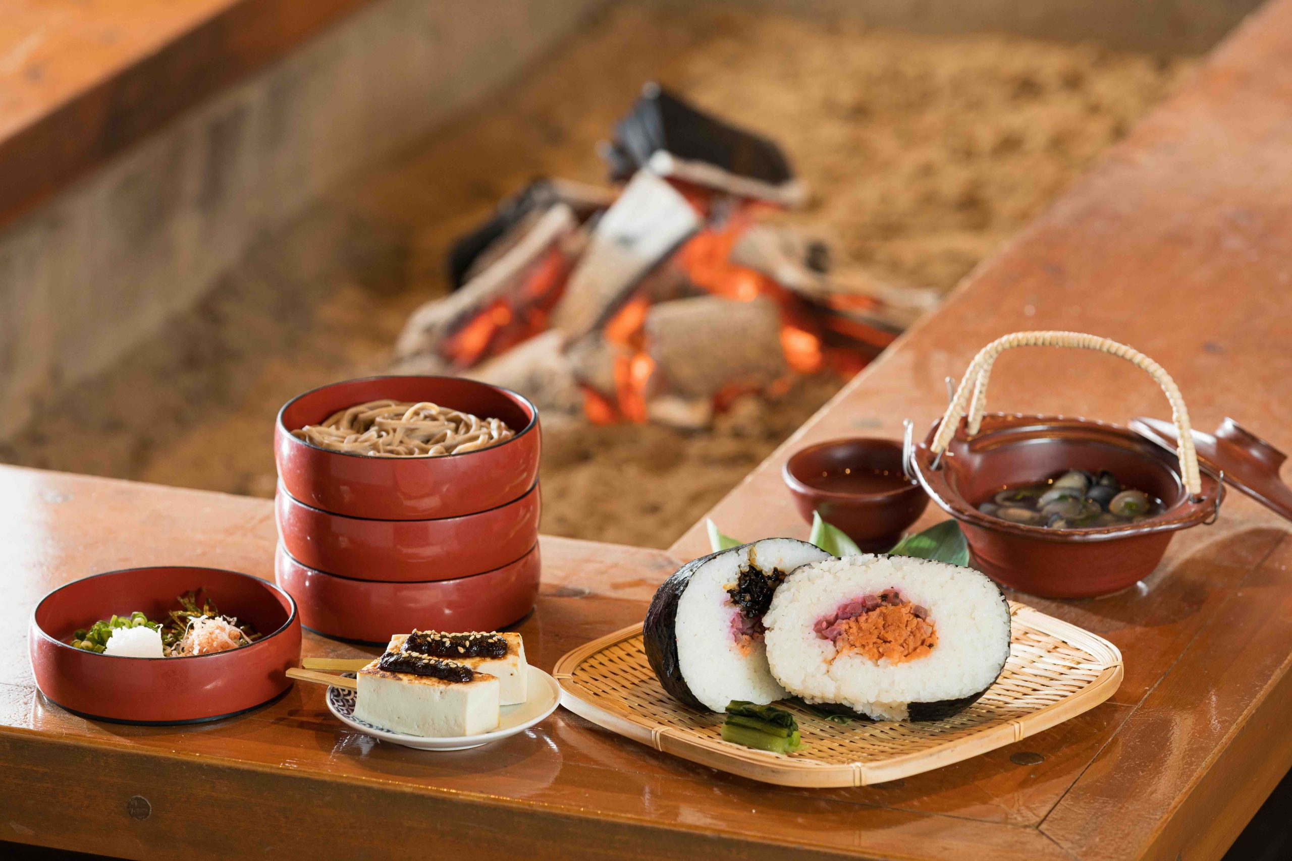 古民家を思わせる梁の高い天井と存在感のある囲炉裏が迎える食事スペース。「発酵」をテーマに、心と身体を整えるお料理を提供します。