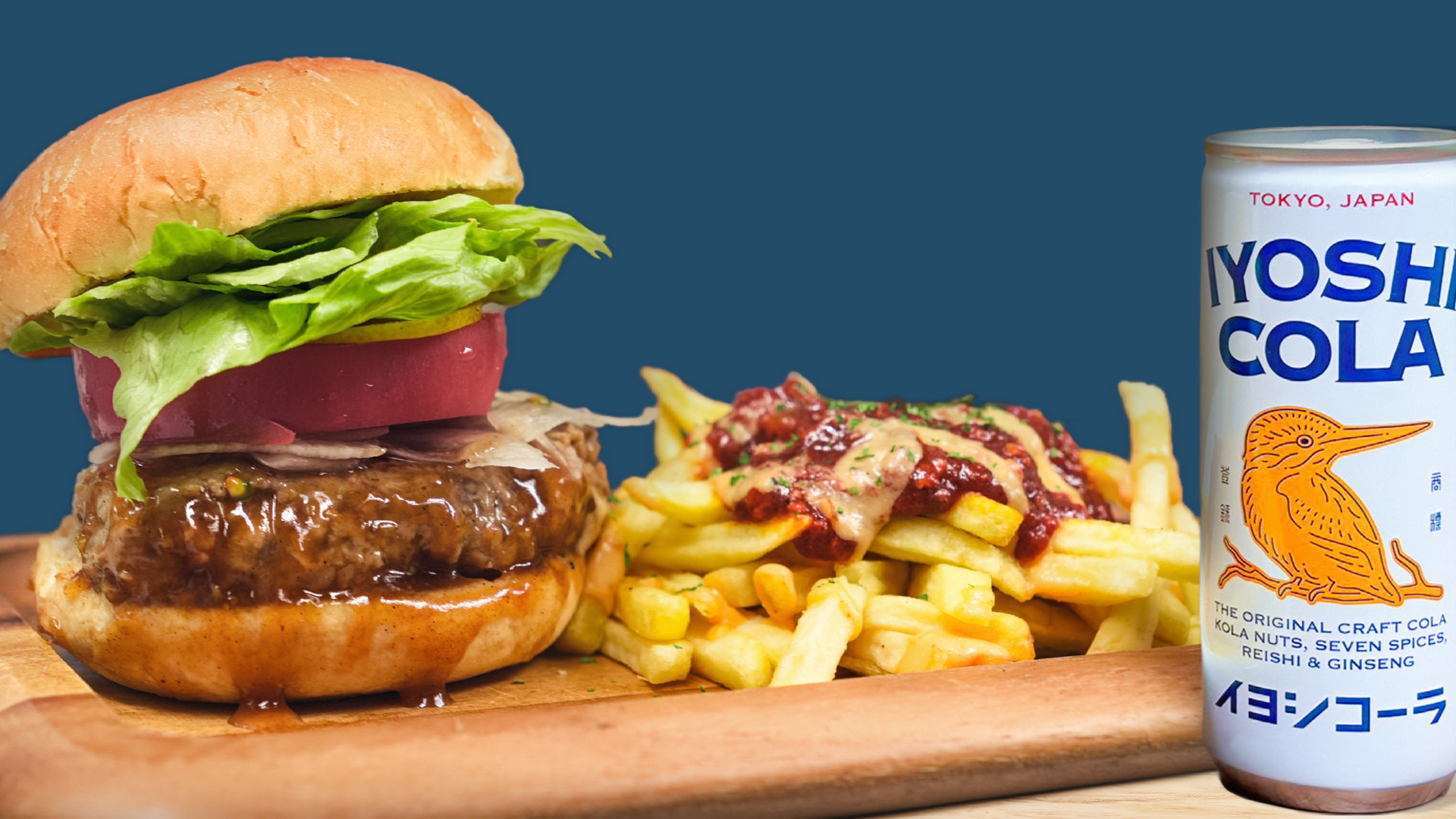 イヨシコーラのオリジナルシロップをふんだんに使用した、ここでしか食べられない期間限定メニュー「テリヤキコーラバーガーコンボ」を販売。イヨシコーラ独自の香りと旨味を活かした一品。イヨシコーラとのペアリングをお楽しみください。