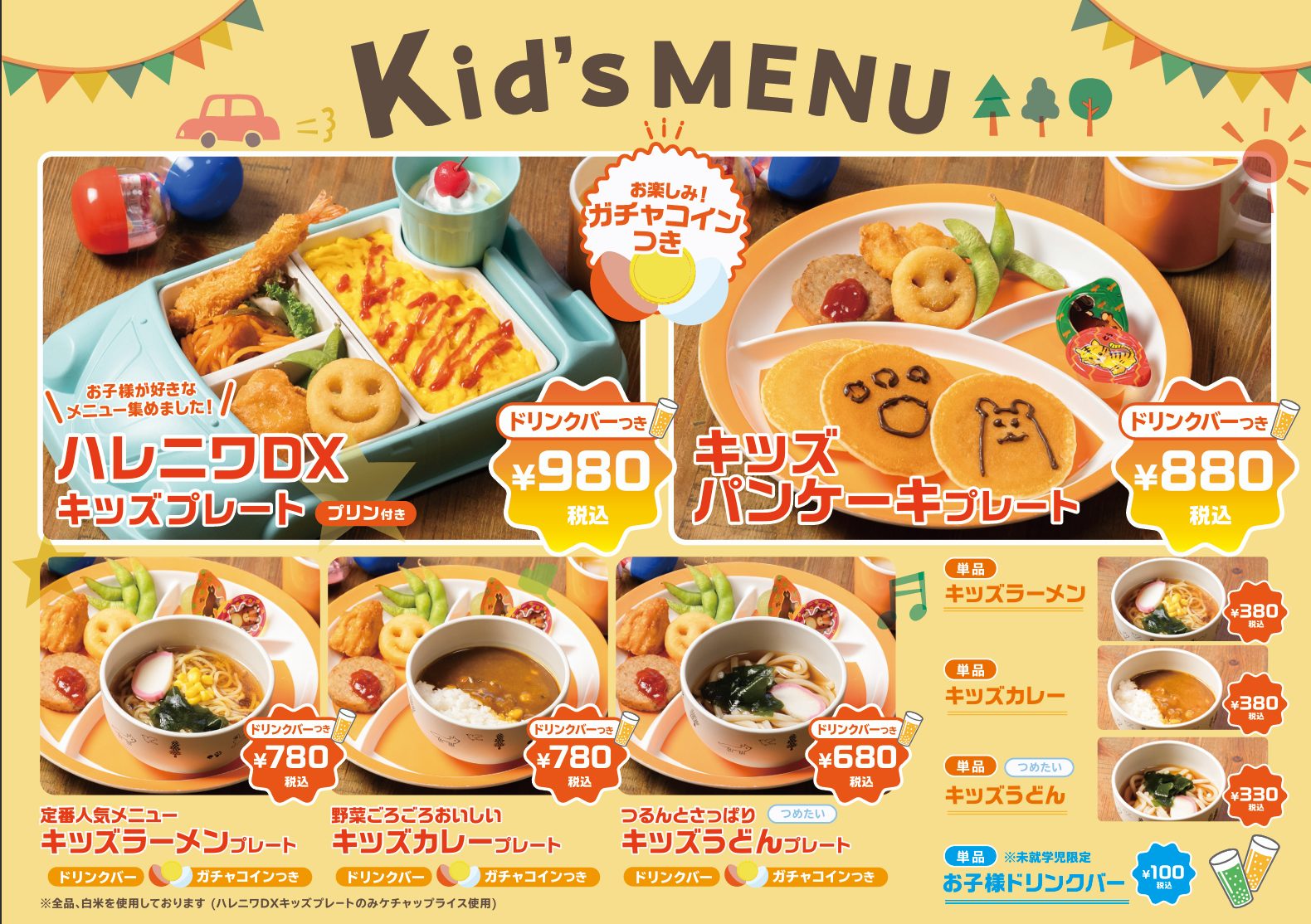 おすすめはハレニワDXキッズプレート。お子さまが大好きなメニューを詰め込みました。ドリンクバーやお楽しみの「ガチャコイン」がセットになったお得なプレートもご用意しています。
