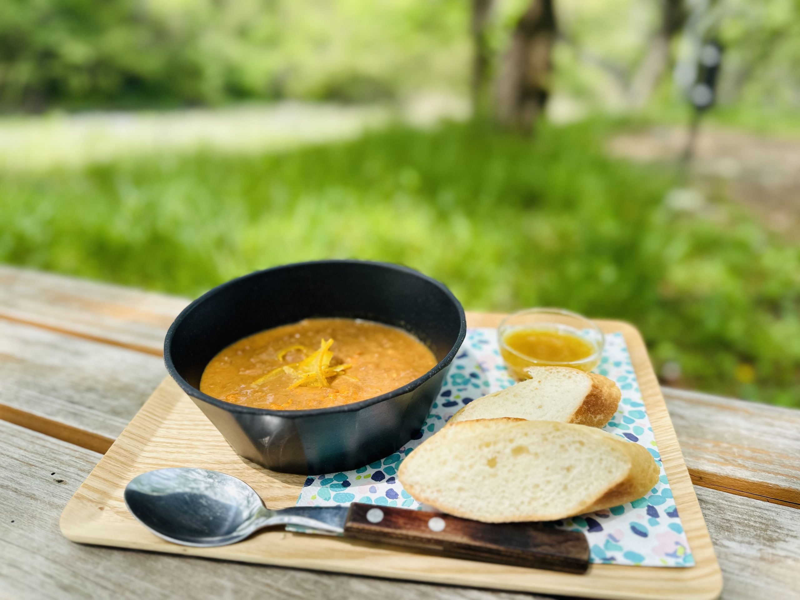 ときがわ町で栽培される柚子を使用した柚子カレーとコモリバ内にあるパン屋さん「小麦の奴隷」のバケットをセットで提供。お好みに合わせて、柚子ジャムをつけて柚子の香りとスパイシーなカレーをお楽しみください。